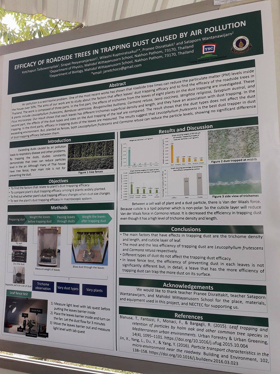 โครงงานนี้เกิดขึ้นจากการสังเกตเศษฝุ่นที่เกาะติดตามใบไม้ที่อยู่ในบ้าน จึงได้ทำการทดลองนำต้นไม้ที่มีลักษณะของใบไม้แตกต่างกันนำไปวางไว้ที่จุดเดียวกัน เพื่อสังเกตว่าใบไม้ลักษณะใดสามารถจับเศษฝุ่นได้มากกว่ากัน จากการสำรวจพบว่าใบไม้ที่มีลักษณะหยาบจะสามารถจับเศาฝุ่นได้มาดกว่าใบไม้ที่มีลัษณะเรียบ แต่ใบไม้บางชนิดที่มีผิวหยาบแต่มีความมันวาวจะจับฝุ่นได้ไม่ดีจากนั้นจึงนำข้อมูลลักษณะใบไม้และการจับฝุ่นของใบไม้ลักษณะต่างๆมาทำเป็นกราฟแสดงผลการทดลอง